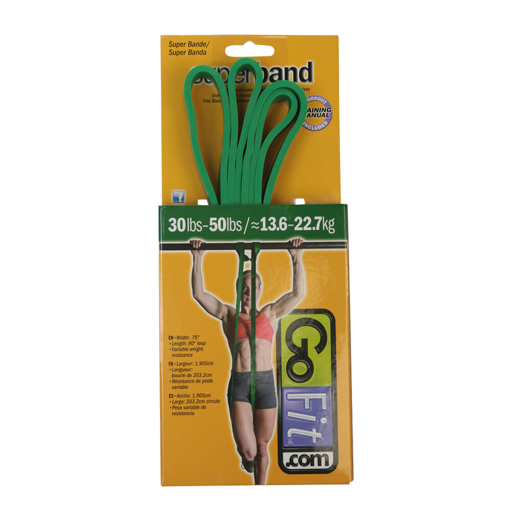 Step up your workout routine with the GoFit Resistance Exercise Band 30-50Lbs Green. The GoFit resistance band is a must- have for popular workout routines like Functional Training, MMA, speed and agility training and strength training. This band is perfect if you’re a beginner or intermediate athlete, as it offers 30-50 lbs of resistance. The included workout manual helps you get started right away. Get results fast with the GoFit Super Band.